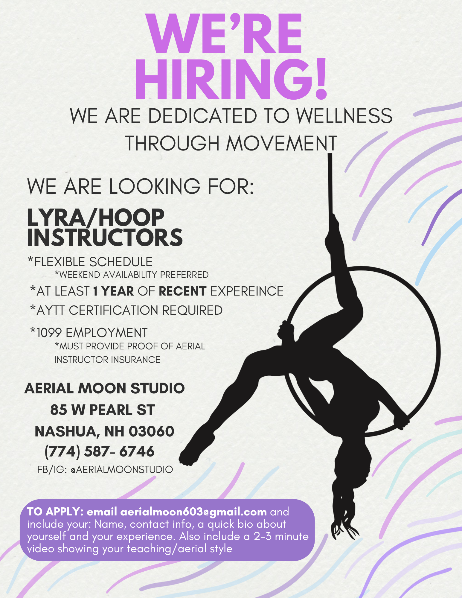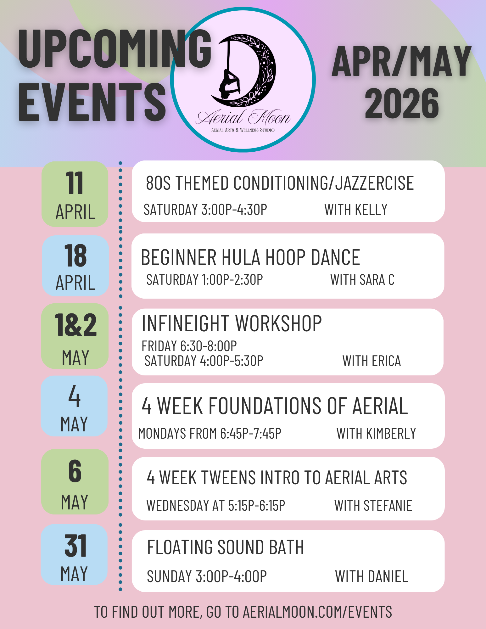 At Aerial Moon we offer a variety of different classes including aerial conditioning, aerial dance, aerial yoga, aerial barre fusion, stretching, restorative breathwork yoga and more! Aerial Arts is a fun and empowering practice that helps to build strength, flexability, mobility, endurance and confidence. Using the silks allows you experience deeper stretches, improved balance & circulation and explore the benefits of inversions. Check out our schedule and come fly with us!