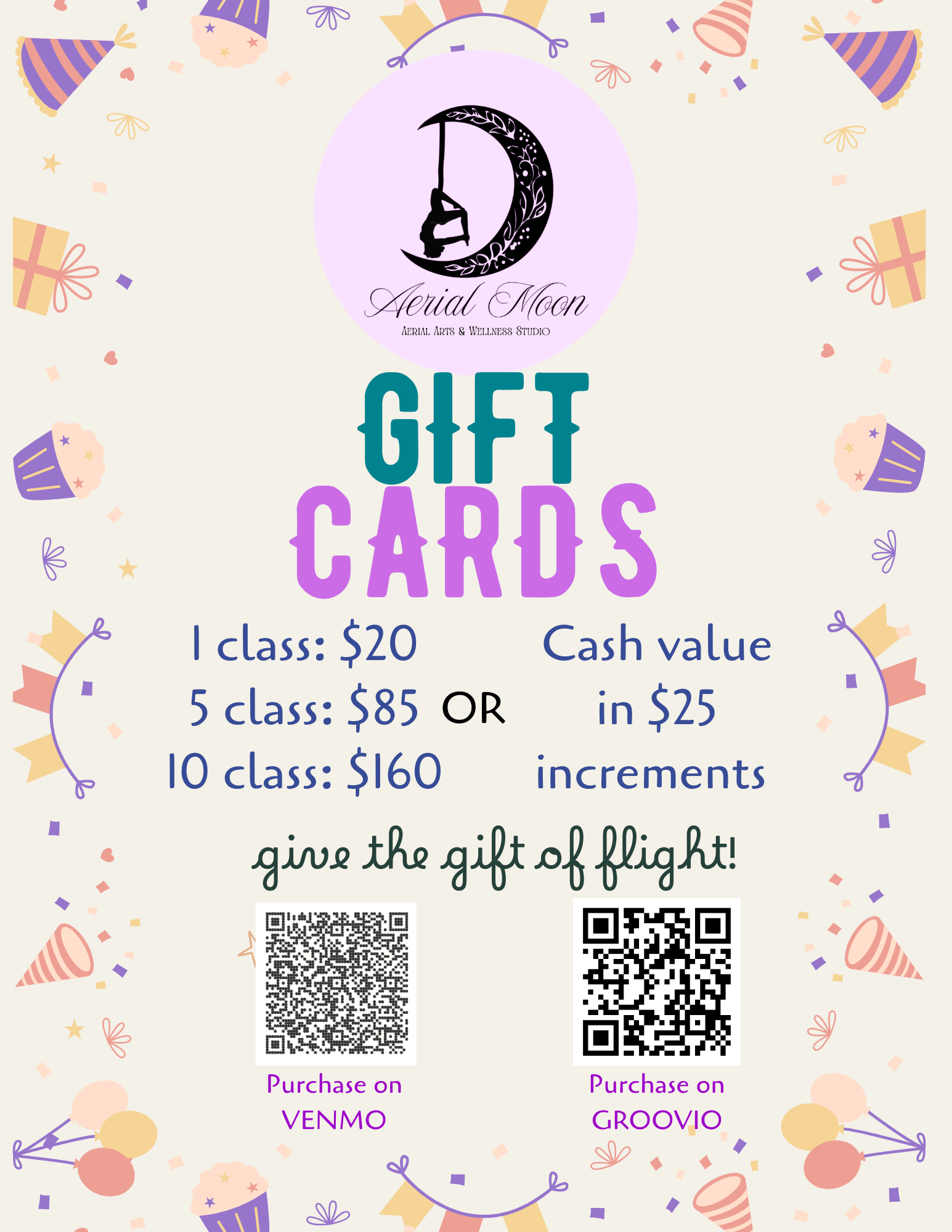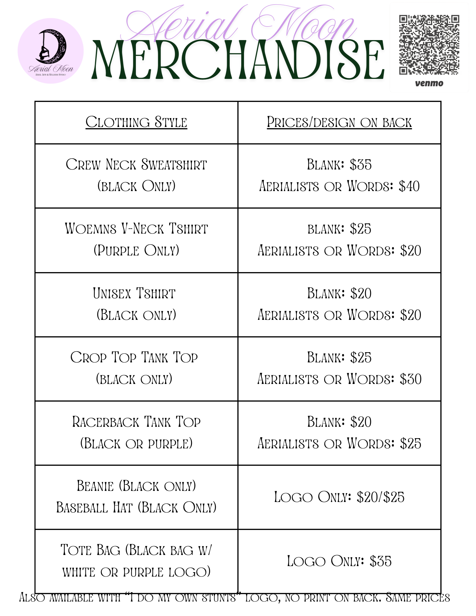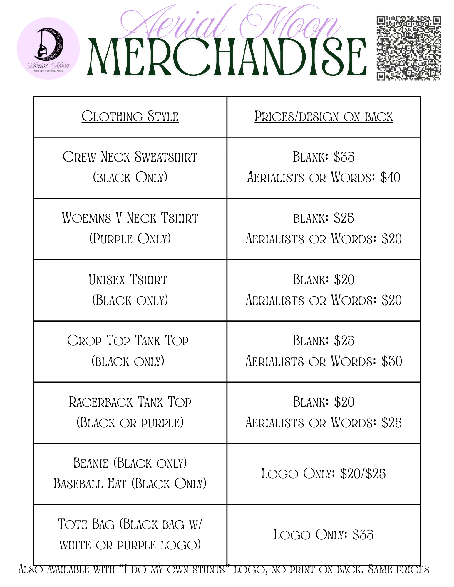 Now available in the studio: Exclusive Aerial Moon Gear! We have crew neck sweatshirts, racerback tanks, crop top tanks, unisex t-shirts, women’s V-neck t-shirts, tote bags, beanies, and baseball hats. If there is any gear you would like to see let us know and we’ll do our best to stock it!
